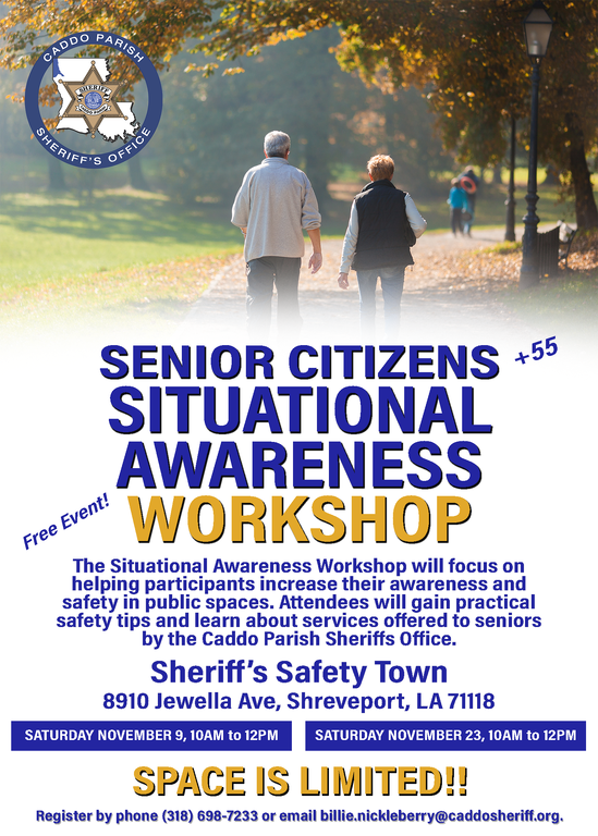 The Caddo Parish Sheriff’s Office Community Relations & Crime Prevention Unit invites senior citizens aged 55 and older to an informative Situational Awareness Workshop. The workshop will take place on Saturday, November 23, from 10:00 a.m. to 12:00 p.m. at Safety Town, located at 8910 Jewella Avenue, Shreveport, LA 71118.