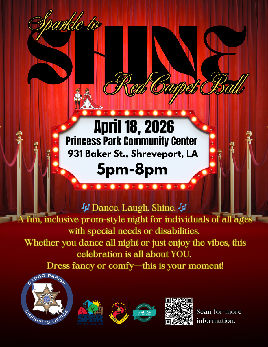 The Caddo Parish Sheriff’s Office, Caddo Parks and Recreation, and SPAR are proud to announce the Sparkle to Shine Royal Ball, an inclusive prom-style celebration honoring individuals of all ages with special needs and disabilities.